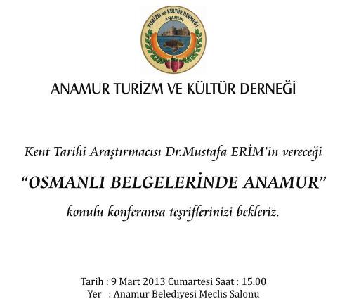 Anamur Turizm ve Kültür Derneği 9 Mart 2013 Cumartesi günü Belediye Meclis Salonu'nda “Osmanlı Arşivlerinde Anamur” Konulu bir konferans düzenleyecek.