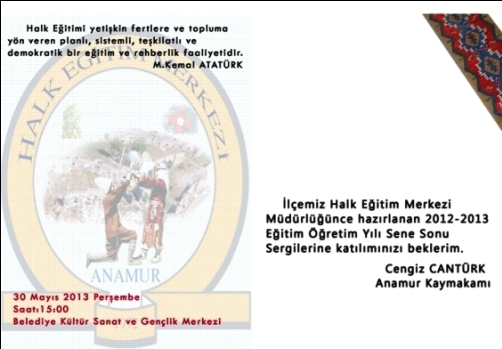 Anamur Halk Eğitimi Merkezi Yılsonu Sergisi Düzenledi Anamur HEM Sene Sonu Sergisi Düzenleyecek, Davetiye dağıtımı tamamlandı… Anamur Halk Eğitim Merkezi Müdürlüğü 2012 – 2013 Eğitim öğretim yılı sene sonu sergisi hazırlıyor. Anamur Kaymakamı Cengiz Cantürk tarafından sergi için bir davetiye hazırlattırılarak Anamur Halk Eğitim Merkezi Müdürlüğünce hazırlanan 2012 – 2013 Eğitim Öğretim Yılı Sene Sonu Sergilerine tüm halkın davetli olduğunu duyuruldu. Anamur Belediyesi Gençlik, Kültür ve Sanat merkezinde düzenlenecek olan sergi 30 Mayıs Perşembe günü, saat:15.00'de açılışla başlayacak.