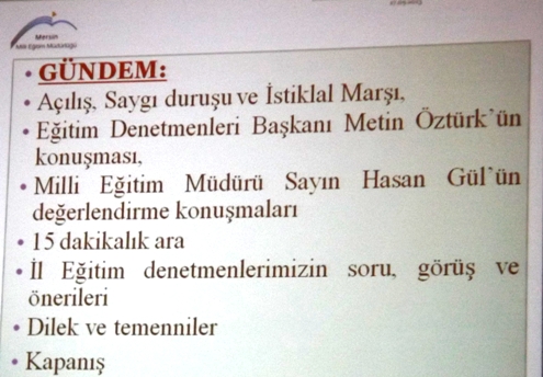 MERSİN'DE EĞİTİM DENETMENLERİ SENEBAŞI TOPLANTISI YAPILDIMersin'de İl Eğitim Denetmenleri 2013-2014 eğitim/öğretim yılı senebaşı toplantısı yapıldı. MERSİN’DE EĞİTİM DENETMENLERİ SENEBAŞI TOPLANTISI YAPILDI Mersin’de İl Eğitim Denetmenleri 2013-2014 eğitim/öğretim yılı senebaşı toplantısı yapıldı. Şükrü Öner Öğretmenevi Anamur “Toplantı” Salonunda yapılan ve eğitim-öğretim konularının görüşüldüğü toplantı Mersin ilinde çalışan eğitim denetmenlerinin tümünün katılım ile yapıldı. Toplantıya İl Milli Eğitim Müdürü Hasan GÜL, Eğitim Denetmenleri Başkanı Metin ÖZTÜRK ve Başkan yardımcıları Yücel PEKER, Raşit AĞRI katıldılar.Toplantı gündem gereğince Atatürk ve şehit öğretmenler için yapılan saygı duruşunun ardından, İstiklâl Marşının okunması ile devam etti.Senebaşı genel kurulunda konuşan İl Milli Eğitim Müdürü Hasan GÜL eğitim-öğretim yılının hayırlı olması dileğinde bulundu. Gül konuşmasında:İlk haftanın Mersin ilinde çok yoğun geçtiğini, okulların bakım ve onarımlarının yapıldığını, okul dönüşüm işlemlerinin gerçekleştirildiğini, iki ilköğretim okul dışında hiçbir okulun genel anlamda eksiğinin kalmadığını, bu iki okulunda kentsel dönüşüm planı çerçevesinde yenilenmesinin söz konusu olacağını, bu yüzden büyük onarımlara girişilmediğini” belirtti.Milli Eğitim Müdürü GÜL: “Geçen yılın değerlendirilmesinin yapıldığında çok güzel başarılara imza atıldığını, sosyal yardımlaşma ve dayanışma vakfının büyük destekler sağladığını, kampus okul yapımına ağırlık verildiğini, engellilere yönelik çok sayıda okul açıldığını, 2 olan okul sayısının 13’e çıkarıldığını, 10 yıl süre ile bu okulların ihtiyacı karşılayacağını, amaçlarının bütün okulların hem fizik, hemde eğitim-öğretim yönünden en mükemmele ulaştırmak olduğunu, oklarda iddia edildiğinin aksine herhangi bir sorun yaşamadan eğitim-öğretime başlandığını, kitap dağıtımlarının gerçekleştirildiğini, okullarda dört yıl için velilerin görüşleri ve çoğunluğunun kararı ile dört yıllığına kıyafetler belirleneceğini, hiç kimsenin öğrencileri özel mağazalara yönlendirmemesi gerektiğini“ söyledi.Gül konuşmasının devamında: “İlde öğrenci yönünden eksiye düşen meslek liselerinin komisyonlar marifetiyle değerlendirildiğini, sbs’nin kalktığını, ne yapılacağının, uygulamanın nasıl yapılacağının kararlaştırıldığını ve bu öğretim yılından itibaren yazılı sınavların bir kısmının bakanlıkça gerçekleştirilmek suretiyle öğrencilerin değerlendirileceğini, sınavlara zorunlu mazeretleri nedeniyle katılamayanlara ek sınav hakkı da tanınacağını, 8. Sınıflarda öğretmen açığı kalmamsı için gerkli çalışmaları yürüttüklerini” söyledi.Eğitim denetmenlerinden aylık çalışma programlarını yaparken sorunlu bölge ve okullara daha çok ağırlık verilmesini isteyen İl Milli Eğitim Müdürü Hasan GÜL iyi dileklerle sözlerini tamamladı. Genel kurulda eğitim-öğretim, eğitim siteminin sorunları ve il eğitim denetmenlerinin yapacakları çalışmalar hakkında değerlendirmelerde bulunan Eğitim Denetmenleri Başkanı Metin ÖZTÜRK geçen yıl çok güzel çalışmalar gerçekleştirdiklerini, başarılı çalışmalar yaptıklarını, katkı sunan tüm eğitim denetmenlerine teşekkür etiğini belirtti.ÖZTÜRK konuşmasında geçen yıl eğitim denetmenlerince gerçekleştirilen çalışmaları grafikler halinde, tablolar halinde slaytlar eşliğinde sundu.Milli Eğitim Müdürü Hasan GÜL’e yardım ve desteklerinden ötürü teşekkür eden ÖZTÜRK: “Görev yaparken sevgi ve saygıyı ön planda tutuklarını, yeni görev alanına giren kurumların denetimlerinin yapılmasına öncelik verdiklerini ve bunda da büyük bir başarı yakalandığın” belirtti.2013-2014 Eğitim-öğretim yılında yapılacak olan çalışmalar ve uygulamalar hakkında da genel kurulu bilgilendiren ÖZTÜRK “MTSK sınavlarının denetimlerinin yapılmasıyla daha iyi bir trafik ortamının sağlanmasına katkı sağlanacağını, öğrenci devamsızlıklarının takibinin yapılacağını, denetim rehberlerinin gruplarca hazırlanarak uygulanacağını” belirterek sözlerini tamladı.Dilek ve temenniler bölümünde söz alan eğitim denetmenleri de alanda karşılaştıkları sorunlar ve iyi örnekler üzerinde durarak eğitim-öğretim çalışmaları ve denetim sorunları üzerinde görüşlerini açıkladılar. Genel kurul sonunda öğretmenevcinde topluca yemek yenilerek toplantı noktalandı.Bu haber 2229 defa okunmuştur.