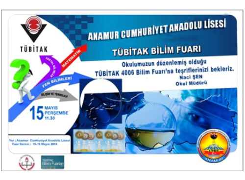 ANAMUR CUMHURİYET ANADOLU LİSESİNDEN TUBİTAK BİLİM FUARI Anamur Cumhuriyet Anadolu Lisesi TUBİTAK Bilim Fuarı düzenledi. Hazırlanan eserler bu kapsamda sergilenerek Anamur halkına sunulacak. Sergi 15-16 Haziran 2014 günlerinde Anamur Cumhuriyet Anadolu Lisesinde gerçekleştirilecek. Serginin açılışı 15 Mayıs Saat:11.30’da.  Okul Müdürü Naci ŞEN TUBİTAK 4006 Fuarına bütün velilerinin ve Anamurluların davetli olduğunu açıkladı.