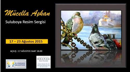 İstanbul’dan Kuşadası’na Suluboya Yolculuğu İstanbullu sanatçı Mücella Aşkan'nın Suluboya Resim Sergisi Kuşadası İbramaki Sanat Galerisi'nde sanatseverler ile buluşuyor. 17 Ağustos’da açılacak sergi, 23 Ağustos 2015 tarihine kadar ziyaret edilebilecek. Sergide sanatçının 40 adet suluboya çalışması yer alıyor.  Serginin açılış kokteyli 17 Ağustos 2015, Pazartesi Saat: 18:00’de, Kuşadası’nda olan ve yolu Kuşadası’ndan geçen tüm sanatseverlerin beğenisine sunuluyor.