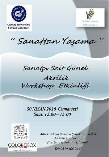 Sanatçı Sait Günel İle Akrilik Seminer&Workshop'uTürkiye’nin önde gelen sanatçılarından Sait Günel'in gerçekleştireceği canlı performanslı Akrilik Seminer&Workshop'u yapılacak. Sanatçı Sait Günel İle Akrilik Seminer&Workshop’u “Sanattan Yaşama” isimli geniş kapsamlı bu projenin eğitim seminer&workshopları; Türkiye’nin önde gelen sanatçılarından Sait Günel’in gerçekleştireceği canlı performansı ile tamamlanacaktır. Ulusal ve uluslararası platformda çalışmaları ile tanınan Sanatçı Sait Günel, sanatseverlerle akrilik alanındaki bilgi ve tecrübelerini paylaşacaktır.